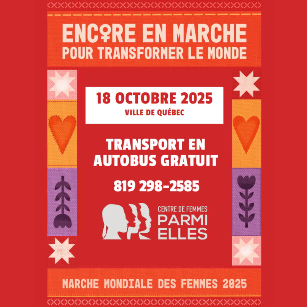 La Collective centre de femmes de Nicolet-Yamaska vous partage les détails concernant la marche mondiale des femmes qui aura lieu le samedi 18 octobre 2025 à Québec.